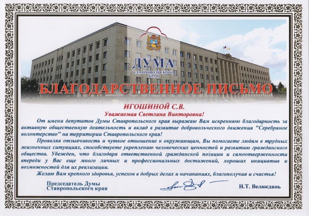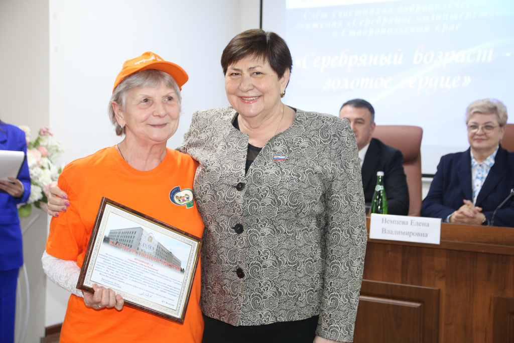 Новости \ Публикации \ 2025 годКраевой слёт участников добровольческого движения «Серебряное волонтерство»Представители отряда «серебряных» волонтёров «Не стареет душа» Ставропольского краевого геронтологического центра приняли участие в Краевом слёте участников добровольческого движения «Серебряное волонтёрство», который проходил на базе Пятигорского государственного университета. Слёт завершился праздничным концертом творческих выступлений серебряных волонтёров и традиционным вручением наград активным участникам добровольческого движения края. За активную общественную деятельность и вклад в развитие добровольческого движения «Серебряное волонтерство» на территории Ставропольского края Игошиной Светлане Викторовне председатель комитета Думы Ставропольского края по социальной политике и здравоохранению Муравьева Валентина Николаевна вручила благодарственное письмо. Добровольческий отряд «Не стареет душа» Ставропольского краевого геронтологического центра награжден дипломом в номинации «Активный участник добровольческого движения «Серебряное волонтерство» в Ставропольском крае» и памятным подарком. Участники слёта поблагодарили организаторов за тёплый приём, полученные знания, яркие эмоции и спели все вместе гимн «серебряных» волонтеров Ставрополья. Назад | Другие тематические разделы: |