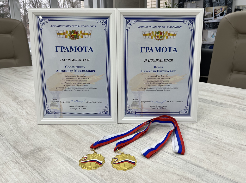 Новости \ Публикации \ 2025 годЕжегодная городская спартакиада «Сильные духом» для людей с ограниченными возможностями здоровья.Ставропольский краевой геронтологический центр в очередной раз может гордиться победителями ежегодной городской спартакиады «Сильные духом» для людей с ограниченными возможностями здоровья в лице Исаева Вячеслава Евгеньевича и Соломенника Александра Михайловича. Спортсмены успешно приняли участие в турнире по шашкам в разных возрастных категориях: от 18 до 35 лет и от 36 до 60 лет и, в справедливой борьбе завоевали «золотые» медали, а также почётные грамоты, заняв 1-ые места в данном виде спорта. Благодарим наших участников за достижение таких высоких результатов и желаем им новых открытий и дальнейших успехов в любимом виде спорта! Назад | Другие тематические разделы: |